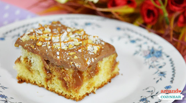 Derrame o doce de leite por cima do bolo e espalhe para que preencha os buracos. Se o seu doce de leite estiver muito duro, esquente por alguns segundos no micro ondas para que fique mais líquido.